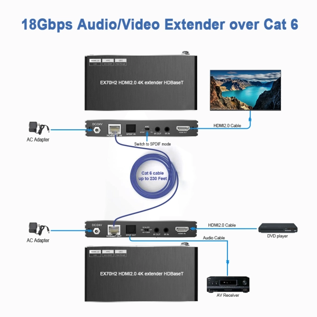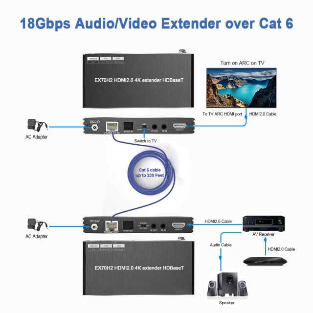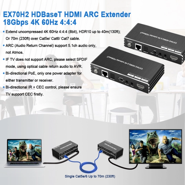 4K60 HDMI HDBaseT Extender with ARC | EX-HE70X | 18Gbps | IR + PoE | SPDIF Audio | 70m/230ft Transmission | HDMI 2.0 | Plug & Play